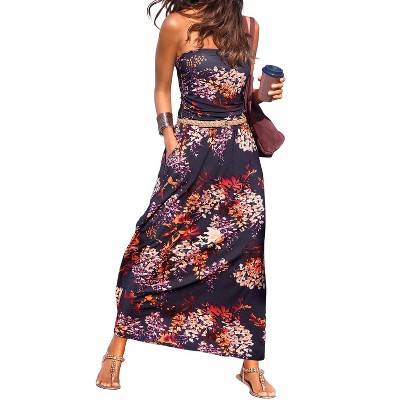 Beautiful floral maxi dress made from soft fabric that is perfect for warm weather. * Strapless neckline with an elastic insert * Elastic waistband with drawstring to tie * Side slit * Side pockets * Print may vary * 100% Viscose. Imported. * Machine wash cold with like colors, inside out * Hang to dry or lay flat