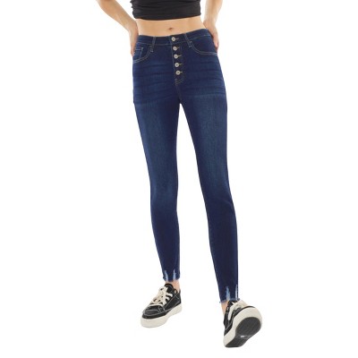 Whether on a walk, on the beach, or at a party, these high-waist denim jeans create a summer mood. * Narrow shape and skinny leg style * Extra-high waistband with belt loops and 5 buttons * 5-pocket design with faux front pockets and real back pockets * Distressed wash * High-quality stretch fabric * Belt not included * Inside leg length approx. 28.75 inches * 97% Cotton, 3% Elastane. Imported. * Machine washable