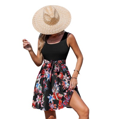 The colorful patchwork print and flowy style of this dress bring a touch of boho to your day. * Short flutter sleeves and V-neck * Elastic waistband with decorative tassel tie * No lining * Crepe, textured woven fabric * A-line silhouette * Print may vary * 100% Viscose. Sustainable Viscose. Imported. * Machine washable