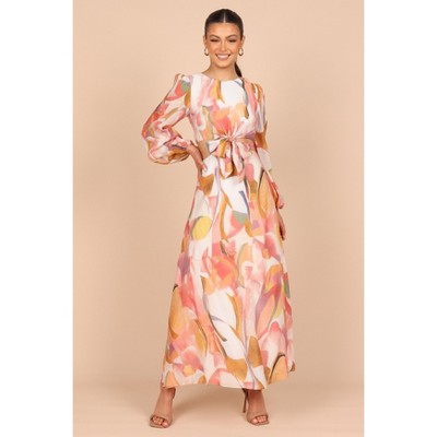 This maxi dress adds boho flare and makes a statement to your day. * V-neckline * Shoulder flounce detail * Semi-sheer sleeves with elastic cuffs * Elastic waistband * Light chiffon fabrication * Fully lined * Length in size 6 approx. 49.6 inches * Print may vary * Belt not included * 100% Polyester. Recycled Polyester. Imported. * Machine washable