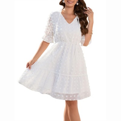 Elevate your sunny-day wardrobe with the LASCANA Women's Polka Dot Midi Dress, a perfect blend of playful charm and timeless elegance. This delightful dress features a delicate micro polka dot print, a flattering A-line silhouette, and a round neckline that exudes effortless style. Puff shoulders and short flutter sleeves add a touch of whimsy, while a self-tie belt with side loops ensures a customizable fit that highlights your figure. The invisible back zipper provides a seamless finish, and the approximately 29-inch skirt length offers a versatile midi style for any occasion. Crafted from lightweight polyester, this dress is comfortable, breathable, and easy to maintain—simply machine wash cold with like colors and hang to dry. Note: Print may vary slightly, making each dress uniquely yours.