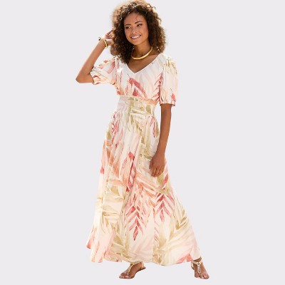 This beautiful maxi dress is perfect for your next vacation. * Decorative springs on the straps * Smocked waistline * Print may vary * Length approx. 54.25 inches * 100% Viscose. LIPR: Sustainable Viscose. Imported. * Machine wash cold with like colors, inside out * Hang to dry or lay flat