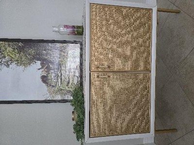 - Constructed of MDF with real rattan doors and metal legs; floor clearance: 10.6 inches