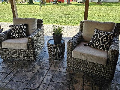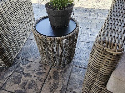 A: The table is made from all-weather wicker and steel with a powder-coated finish.