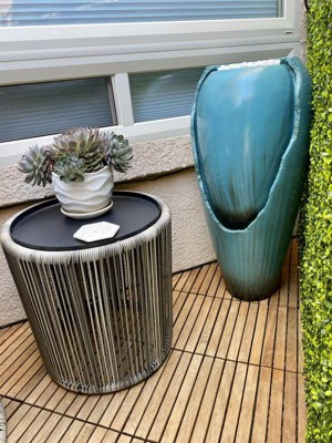 A: Hi Itsme - This side table will add a new level to your patio space! The table top is steel. Hope it works out! - Patricia