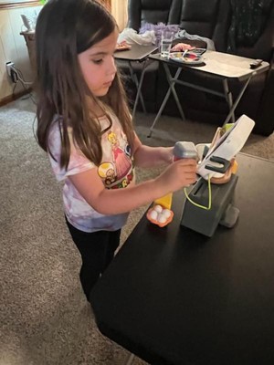 [This review was collected as part of a promotion.] The shop and scan corner store is fun to play with but it doesn't last long. The toy food is neat and the hand held scanner beeps but its attached to a wire, the checkout counter does not stay in place. The paper like money is totally cool along with the big plastic coins!