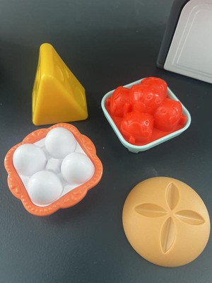 - 20 play pieces, including bread, cheese, eggs, strawberries, box of crackers, box of cookies, sandwich, carton of milk/juice, 11 pieces of money, 1 credit card