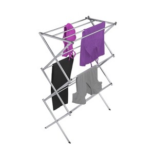Laundry 360's folding drying rack is the commercial-grade rack for air-drying clothes. Eliminating the use of machines is the perfect way to save electricity consumption and that means saving money. Constructed from steel, the accordion design drops and locks into place; folds flat to 3-inch width for storage. The design allows for clothes and household items to dry draped or laid flat. With over 25ft of linear storage space and 11 drying bars you can dry a number of clothes at once. No tolls required, comes pre-assembled.