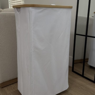 I love this white laundry basket with the bamboo stripe — it looks so elegant! The best part is the four wheels; I can move it anywhere effortlessly. Perfect mix of beauty and functionality! 🧺✨