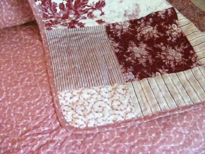 [This review was collected as part of a promotion.] Laura Ashley-Celina Patchwork quilt and shams is very well made. The quilt and shams has a beautiful design of dark red plain weave Patchwork. The stitching is very good. Materials the quilt and shams is made from is 80% cotton and 20% polyester making the quilt very warm, not to heavy or light. The quilt is 90 inches x 90 inches the shams size is 21 inches x 27 inches. Very nice quilt and shams. I definitely would recommend this product.