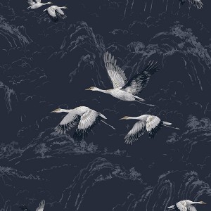 A full roll of this product is 20.5 inches wide and 396 inches long. A full roll can cover up to 56 square feet depending on the design match and pattern repeat. A sample of this product is 8 inches by 11 inches. With a contemporary yet classic feel, Animalia is perfect for adding depth to your home décor. Grey and white cranes on a midnight blue background are graceful while mysterious. Shimmery accents on a smooth background enhance the overall feel of the room. Offers a smooth, untextured finish. Offset match with a 20.87 inch pattern repeat.