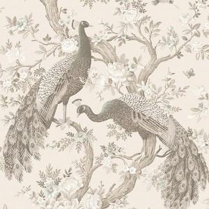 A full roll of this product is 20.5 inches wide and 396 inches long. A full roll can cover up to 56 square feet depending on the design match and pattern repeat. A sample of this product is 8 inches by 11 inches. Choose glamour and sophistication with the stunning Belvedere wallpaper. Classically ornate, this print features elegant peacocks perched in climbing branches and timeless florals. In the rich truffle brown colorway, it is serene and stately in a calming neutral color palette. Offers a smooth, untextured finish. Offset match with a 25.2 inch pattern repeat.