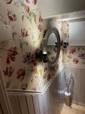 A full roll of this product is 20.5 inches wide and 396 inches long. A full roll can cover up to 56 square feet depending on the design match and pattern repeat. A sample of this product is 8 inches by 11 inches. Make a bold statement in any room with Gosford Meadow wallpaper. This Laura Ashley classic features an abundance of blooming tulip flowers in a riotous colorful display. Pale cranberry details on a neutral background are fun and elegant. Offers a smooth, untextured finish. Offset match with a 25.2 inch pattern repeat.