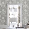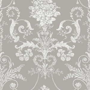 A full roll of this product is 20.5 inches wide and 396 inches long. A full roll can cover up to 56 square feet depending on the design match and pattern repeat. A sample of this product is 8 inches by 11 inches. A Laura Ashley classic, Josette is an ornate and elegant damask. Featuring glamorous chandeliers and romantic rose bouquets, this wallpaper is undeniably elegant. Our French-inspired damask design adds a contemporary edge in steel grey and white tones. Offers a smooth, untextured finish. Straight match with a 25.2 inch pattern repeat.