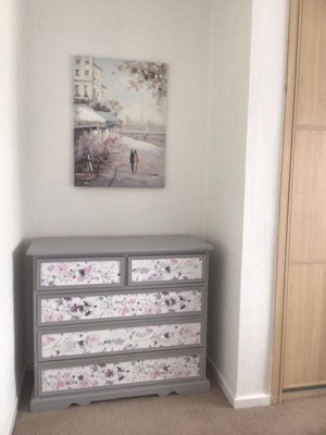 So easy to use- looks fabulous on bedroom walls. Tones so well with grey. Buy it you won’t be disappointed. Paint old pine cabinets in grey and use crystal knobs to finish off!!