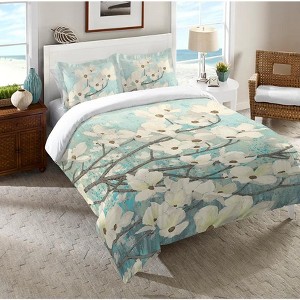 Bring a touch of spring into your bedroom with the elegant and delicate floral design of Laural Homes Dogwood Blossoms comforter. Set on a serene blueish background, the soft white, hand-painted dogwood blossoms will invite the beauty of the season into your bedroom any time of the year.