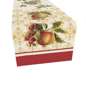 Beautify your dining area this holiday season with Laural Homes Festive Opulence table runner. This fresh design features vibrant fruits and flowers picked from a classic holiday garden and set against an ornate gold-toned pattern. The deep red and green hues will add warmth and elegance to your dining décor this winter season.