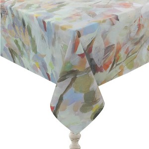 This landscape-inspired tablecloth, "Nature's Melody," is a sweet and calming home decor look. The peaceful design features warm tones of green, red, brown, and orange leaves tossed to create an abstract multicolored look. This tablecloth will bring a surreal scene of nature to any table.