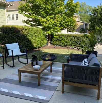 I’m pleased with this set. It was easy to assemble and it looks nice. Hoping it will weather alright. I picked this one over other similar styles because the cushions were extra thick and I thought they might be more comfortable... they aren’t lol. They’re pretty hard, but that’s alright. The fabric is sturdy and it’s easy to brush dirt off of. The color is a much more neutral gray than the pictures. On the website it almost looked purple, but it doesn’t in real life.