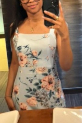 Wore this to a wedding and couldn’t have been happier with my choice. I typically stick to solid colors (my comfort zone) but the soft blue with just the right amount of pink /mauve/green flowers to contrast was perfect. Beautiful dress that fit perfectly.