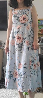 Wore this to a wedding and couldn’t have been happier with my choice. I typically stick to solid colors (my comfort zone) but the soft blue with just the right amount of pink /mauve/green flowers to contrast was perfect. Beautiful dress that fit perfectly.