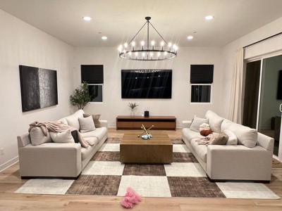 [This review was collected as part of a promotion.] Let's discuss the style of the Lauren Liess Aspen Checkerboard Fringed Area rug. This rug exemplifies elegance and sophistication. It is not only aesthetically pleasing but also exceptionally well-crafted and durable. The thick padding provides a soft and cushioned feeling underfoot, enhancing the overall comfort of the rug. The fringed ends add a touch of charm and character to the design. I placed this rug on hardwood floors and found that it remained in place without the need for a rug gripper. Its dimensions of 4ft x 6 1/2ft make it suitable for covering a substantial area while maintaining versatility for various placements. The color combination of tan and brown seamlessly complements a wide range of interior styles and decors. I chose to place this rug in my living room, where it beautifully complements the dark brown and tan recliners, as well as the dark walnut-colored entertainment stand. The rug elevates the overall ambiance of the room, adding a touch of elegance and warmth.