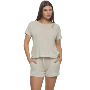 All the soft texture vibes in this linen blend sleep set - the Lauren Collection is just the set you need in your wardrobe. A soft crew neck tee & drawstring shorts make it ideal to wear on those warm days running errands or as comfortable pajama set. · 2 piece set · Hi-lo hem tee · Drawstring waist · Relaxed fit · Pocket details Fabric Content: 55% Linen, 45% Polyester Wash Before Wearing. Machine Wash Cold With Like Colors. Delicate Cycle. Only Non-Chlorine Bleach When Needed. Tumble Dry Low. Do Not Iron. Do Not Dry Clean.