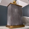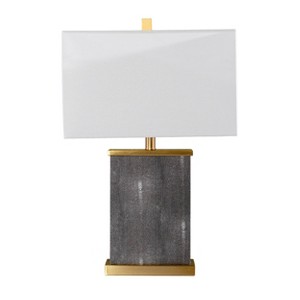 Dress up your decor with this textured table lamp. Black faux shagreen wraps the rectangular frame, while the gold base and hardware add a touch of metallic sparkle to your space. A white linen shade completes the cohesive design,crafting a crisp, classic feel in your family room or formal entryway. Complement your living room design or shine a light on your home office workspace with the transitional appeal of this table lamp.