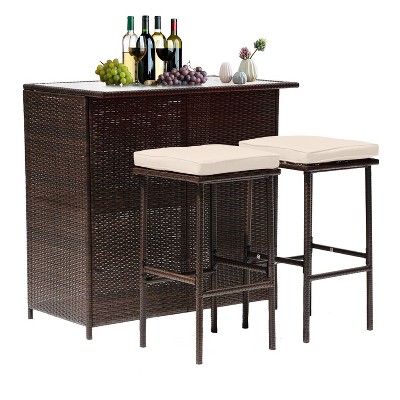 - This 3-piece patio chair set includes a glass-topped rattan side table with a handy storage nook and 2 outdoor chairs
