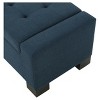 This ottoman is exactly what we were looking for. The size is perfect for the end of our queen bed. My son often sits on it to play video games when we don't want to give up the living room. It's comfy to sit on, and seems sturdy. The dark blue is perfect. It's somewhere between navy and a dark denim, so it blends well with our decor, and would look nice in just about any room. The inside storage is great too- perfect for several blankets, sheets, extra bedding. If it lasts 8+ years like our last ottoman, I'd definitely purchase it again.