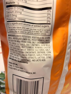 dried potatoes, vegetable oil (corn, canola, and/or sunflower oil), potato starch, whey, maltodextrin (made from corn), salt, cheddar cheese (milk, cheese cultures, salt, enzymes), skim milk, natural flavors, buttermilk, romano cheese (part-skim cow's milk, cheese cultures, salt, enzymes), whey protein concentrate, dextrose, corn oil, yeast extract, onion powder, garlic powder, spices, sea salt, turmeric extract (color), lactose, citric acid, milk protein concentrate, and lactic acid.