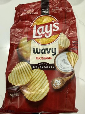Wavy Lay's potato chips have all the crispy, fresh taste made famous by Lay's potato chips, with a Wavy crunch all their own. They feature delicate and crispy ridges, making them ideal for dipping. Wavy Lay's Original potato chips are made with only three ingredients: potatoes, vegetable oil and salt. As a result, the classic, savory potato chip flavor shines through and highlights the flavor of dips. Perfect at parties, Wavy Lay's chips are great for dipping; or enjoyed on their own ! scoop up some chips and keep the party hopping!