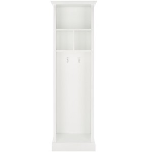 Introducing the Layli 4 Shelf 2 Hook Top Storage Hall Tree in a charming antique white finish. Crafted from wood, this elegant piece blends functionality with style. The hall tree offers four spacious shelves, perfect for organizing shoes, bags, or accessories, while the two hooks keep your coats and hats easily accessible. Its antique white color adds a touch of warmth and sophistication to any entryway or hallway. With its versatile design, this hall tree is a wonderful addition to both modern and traditional interiors. Enhance your home organization and create a welcoming space with the Layli hall tree.