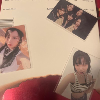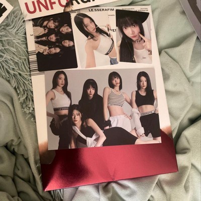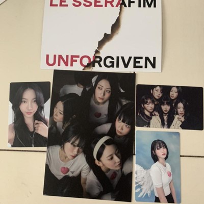 - LE SSERAFIM is back with a new album titled UNFORGIVEN. LE SSERAFIM members SAKURA, KIM CHAEWON, HUH YUNJIN, KAZUHA & HONG EUNCHAE recently debuted at #14 on the Billboard 200 with their album ANTIFRAGILE and have now released their 1st Studio Album. Contents of the album include CD, Outer Box, Booklet (128 pgs), Photo Card (random 1 of 5), Postcard, Heat Detecting Postcard, Sticker and Folding poster. US/EU Retail Exclusive: Photo Card (55 x 85mm). Dimensions: 260 x 192 x 16 mm.