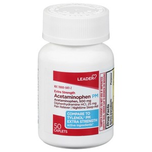 Get the restful sleep you need while relieving pain with Leader Acetaminophen PM Extra Strength 500 mg Caplets. Specially formulated to provide dual-action relief, this nighttime pain reliever combines acetaminophen, a trusted non-opioid pain reliever, with diphenhydramine HCl, a nighttime sleep aid commonly used to relieve occasional sleeplessness. Whether you're experiencing minor aches and pains from headaches, backaches, arthritis, or muscle soreness, these caplets offer powerful relief so you can drift off into a peaceful, uninterrupted night’s rest. Each dose delivers 500 mg of acetaminophen to reduce pain and 25 mg of diphenhydramine to help you fall asleep faster and stay asleep longer. Ideal for adults dealing with pain-related sleeplessness, this non-habit-forming sleep aid is free from NSAIDs, making it a gentler option for individuals who want effective relief without stomach upset. Leader Acetaminophen PM is your go-to companion for overnight comfort and recovery.