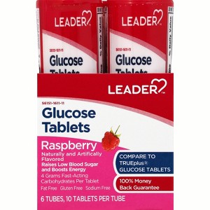 Leader Glucose Chew Rasp Tabs 10 CT: Leader Glucose Chewable Raspberry Tablets are the perfect on-the-go solution for managing low blood sugar. These convenient and fast-acting glucose tabs provide an immediate boost to restore your blood sugar levels. With a delicious raspberry flavor, these chewable tablets are easy to consume when you need quick glucose support during the day.