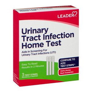 3 test strips. Individually wrapped. Aids in screening for urinary tract infections (UTI). Easy to read. Results in 2 minutes. Compare to Azo Test Strips (This product is not manufactured or distributed by Amerifit, Inc., or Amerifit Brands, Inc., distributors of AZO Test Strips). Leader Urinary Tract Infection Test Strips can be used as an aid in the screening of a urinary tract infection (UTI). Test strips are similar to the tests most doctors use. Leader" test strips test for both Leukocytes (white blood cells) and Nitrite. Use Leader UTI test strips if you experience any of the following: urinary pain, urinary burning, urinary urgency or increased frequency of urination. Essential to care since 1979.