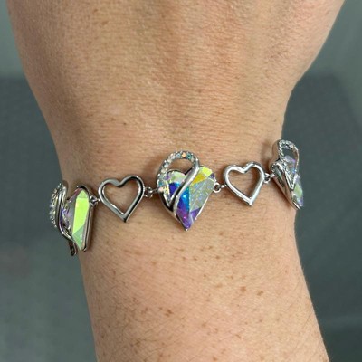 - Specifications - bracelet charm size: 0.53" x 0.68"; bracelet length: 7"+ 2"; plating: rhodium plated silver-tone; clasp: lobster claw; stone: sweet heart fancy stone, opal rainbow white; flatback zirconia rhinestones, crystal ab color.