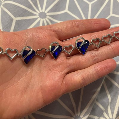 [This review was collected as part of a promotion.] This sapphire blue heart bracelet is a symmetrical and simple style with a touch of sparkle. The heart stones are slightly lighter than I anticipated, more of a royal blue than sapphire blue in my estimation. They have a fire or sparkle in them that is nice to watch under light. They have little looping embellishments around them which adds a bit more glam to the look. The bracelet is fairly heavy and comes with a nice clasp and chain adjustable section. It is good quality and nice for times you would want to dress up.
