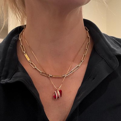 [This review was collected as part of a promotion.] I was looking for an elegant but edgy statement necklace, and since ruby is my birthstone I was drawn to this necklace. The diamond embellishment reminds me of some high end designer styles, it is so cool. It pairs really well with my other gold necklace, so I think it is a good layering piece. The only thing that I noticed is where the stone is affixed to the setting there's a clear separation and makes me worry about quality issues. I would hate to lose the stone!