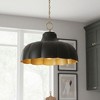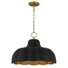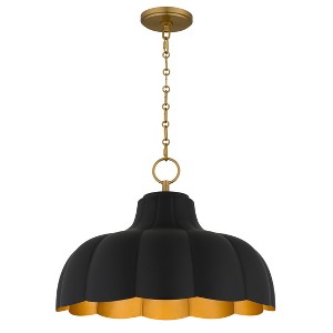 Bathe your space in the warm, golden glow of the Leanne Pendant Light-a timeless piece where classic form meets modern charm. With its gracefully contoured metal shade, the Leanne is finished in a rich matte black that exudes quiet sophistication. Inside, a surprise awaits: a brushed brass interior that captures and reflects light like the soft flicker of candlelight, casting a warm, romantic ambiance. Suspended from a delicate chain with golden links, the Leanne sways gently with the rhythm of the room-perfect for intimate dinners, cozy reading nooks, or serene bedrooms.