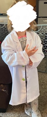 [This review was collected as part of a promotion.] My daughter loves playing dress up and this was the perfect addition. It's high quality and will fit her for a while. She pretends to be a doctor or scientist. The glasses seem like they will handle a lot of use too! They don't completely fit her face yet but she doesn't care. It doesn't seem like it will easily stain either which is a huge plus since it is white.