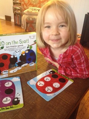 This math skills game from Learning Resources is another win in their column! Featuring cute cartoon ladybugs all with numbers on their spots, children are challenged to fill their spots by adding the number on the ladybug to a spot to equal 10. For example, if your ladybug's open spot has a two on it, you need to get a spot with the eight. You can play this competitively, by flipping spots one at a time and having whoever is the fastest to grab it - first one to fill their ladybug, wins! Or, the first few times we played, we played cooperatively. We each had a ladybug and as we went through the game, we would figure out what would get us to 10 (phrasing it different each time as to get them used to the different math terms) and then finding who needed that number.