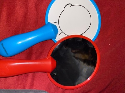 - Handheld boards feature the outline of a face on the write & wipe side and a mirror on the other side