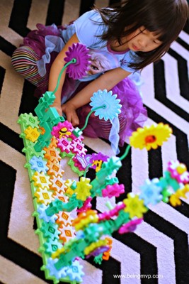 The Build & Bloom Building Set contains 116 pieces from various colored gears to flowers, stems, butterflies, bees and more. There are base pieces that the gears snap onto and the flower stems then you can move the gears around to watch them all move. My boys had something similar to this when they were younger and loved it, its funny how such a simple toy can encourage so much fun. When my daughter first opened it, she said for an hour and played with it. That was a huge chunk of time for her to play with a toy. Since then this set has become a daily fixture in our family room. After putting it away a few times and my daughter asking for it again I decided to just leave it out! Even my 6 year old son started playing with it and building with it. The set really does have a lot of pieces that a few kids could play with it at one and have plenty to do. I love when toys have enough pieces for kids to share otherwise there tends to be fighting with kids with want this piece or that piece. The gears are all super bright and colorful too, it is nearly impossible for a kid to not want to play with them! I received this product to review in exchange for sharing my honest opinion.