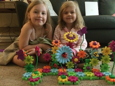 Your child can plant their own spring flower garden with the 116 pieces: gears, flowers, butterflies, bees, ladybugs, wiggly stems and more. The parts are all interchangeable so it's really up to their imagination on what their final garden will look like. The pieces easily snap together so even though the recommended age is 4+, Mason is able to play alongside Kenzie. When the garden is assembled, turn the gears and the smiles and giggles come out.