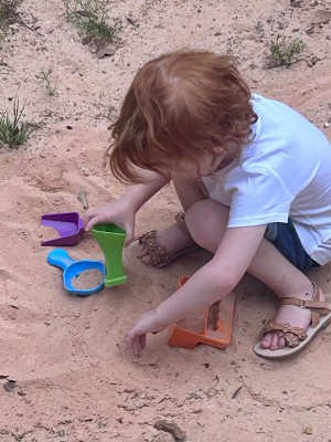 [This review was collected as part of a promotion.] At first glance, I didn't think these were going to be very special. We have shovels, spoons, funnels, etc. But after taking them out, feeling them, and watching the kids play with them, I have to say I really love them! They are thick, sturdy plastic that is going to withstand long term use/use by multiple children. The orange scoop encourages a different grip and gets a BIG scoop, which is super motivating. The sifter worked great in our oat sensory bin, letting just enough out for them to "sprinkle" their pies. The funnel I think is my absolute favorite. The flat edge allows children to easily scoop with the funnel portion and then allow the contents to fall out of the smaller side into the container. Never thought to use a funnel this way, and honestly didn't think to with this one but the kids did it immediately and loved it! Genius. I'd honestly buy a pack of all funnels if they made it. All the photos are a little blurry because they were constantly moving and working with these - another plus!