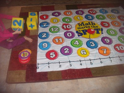 The Math Marks the Spot game is not a little floor game. This is a big game that you play and lay out on the floor. The fact that the game is so large makes it even more fun. It makes it more interactive and I can see that if it was played in the classroom the kids would really get into this. I also love the different games that can be played. There is not one set way to play this game. I can cater it towards what my child needs. This can even be used for younger children just for number recognition. It can be used for older children to have them identify Greater Than or Less Than. The instructions come with about 6 games that you can play with the board. It can even be used for help with counting. This educational game is appropriate for children that are in Kindergarten through grade 2. I just happen to have one child in kindergarten and one in second grade. This game is just perfect for us. My kids love that they get to roll the giant dice. This is really fun for them. They then have to walk over to the correct answer and put the marker on it. (product provided for free for blog review)