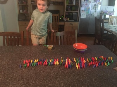 [This review was collected as part of a promotion.] My two year old and I spend a lot of time dumping these dinos out and putting them back in, when we do we sort it by colors and then we count as we go.