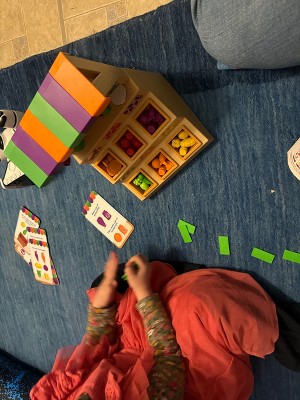 [This review was collected as part of a promotion.] I used this toy with my son to teach him the colors and also different fruits and vegetables. It was so cute and small for his little hands. He enjoys playing with it and always asks to play with it. I wish it came with a bag to keep the small pieces all together! I didn't like the cardboard papers. It's very educational and perfect for my son who is 3.5 years young now.